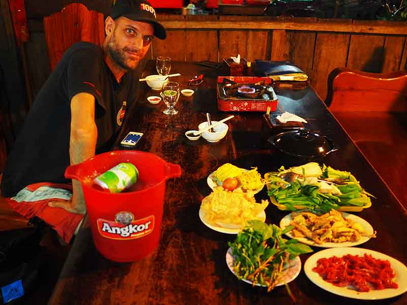 We started off the tour with a night on Kulen Mountain, the ancient pre-Angkor capital. We drove through picturesque villages and some nice section s of single track as we made our way through the forest to the base of the mountain. Kurt was up for trying the local culinary delights, so we stopped for a drink and some honeycomb bee larvae and stuffed frog. Tasty! We started the climb up the mountain, which was pretty easy going as the road up there is in good condition. After stopping for lunch Kurt checked out the waterfall, while I fixed another puncture…number 5 in 48 hours! We were going to see the Stone Elephant, but as it was getting late we opted for the main trail to our homestay for the night in Anlong Thom village. We traversed our way through puddles and rutted trails arriving just before sunset. After a shower, we feasted on the spread they always provide for us there. Nice one Mr. Pich!